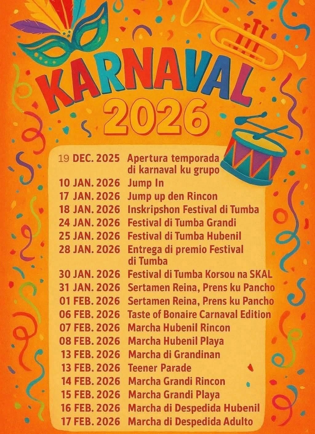 - February 8, 2026 – Children’s Parade in Kralendijk (Marcha Hubenil Playa). Parade typically begins at 3 PM and ends at 6 PM (estimated times based on prior years).