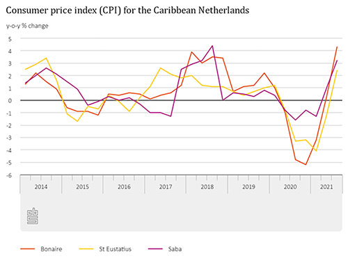 In the third quarter of 2021, Bonaire’s consumer prices of goods and services were 4.3 percent more expensive than one year previously. In the second quarter, inflation stood at 0.3 percent. This is reported by Statistics Netherlands (CBS) on the basis of the consumer price index for the Caribbean Netherlands (Bonaire, St. Eustatius, and Saba).